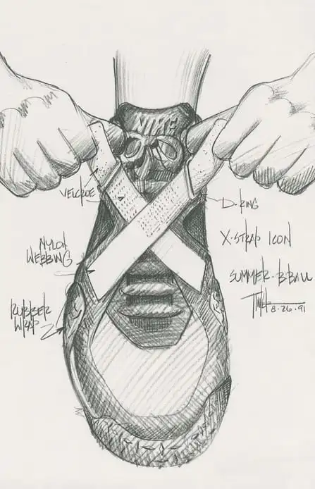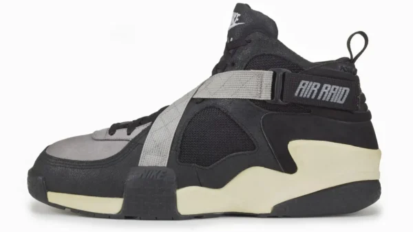Arriva il 1993 e scendono in campo le Air Raid II: stessa idea, ma più armatura dove serve. Nike la descrive come evoluzione con fascette incrociate in pelle per aumentare la durata e una tomaia leggermente modificata. Quel cinturino inconfondibile dal punto di vista pratico è fenomenale, l’X-Strap infatti blocca il piede degli atleti. Composto da chiusure in velcro, cinturini in nylon intrecciato e una fascia in gomma (fondamentale), l’X-Strap offre maggiore supporto e stabilità rispetto a un tradizionale cinturino sull’avampiede. È l’epoca in cui Air Raid diventa, per tanti, una specie di uniforme non ufficiale del basket da strada: riconoscibile a distanza, aggressiva, fatta per reggere.